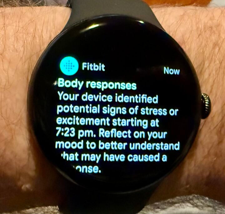 After a stressful afternoon, I was starting to calm down. Just as I lay my head back on the couch and closed my eyes, listening to music, the watch popped up to tell me I was stressed. I’m not sure what the watch was doing earlier when I was ready to shout at everyone in sight; maybe it was too scared to speak up.